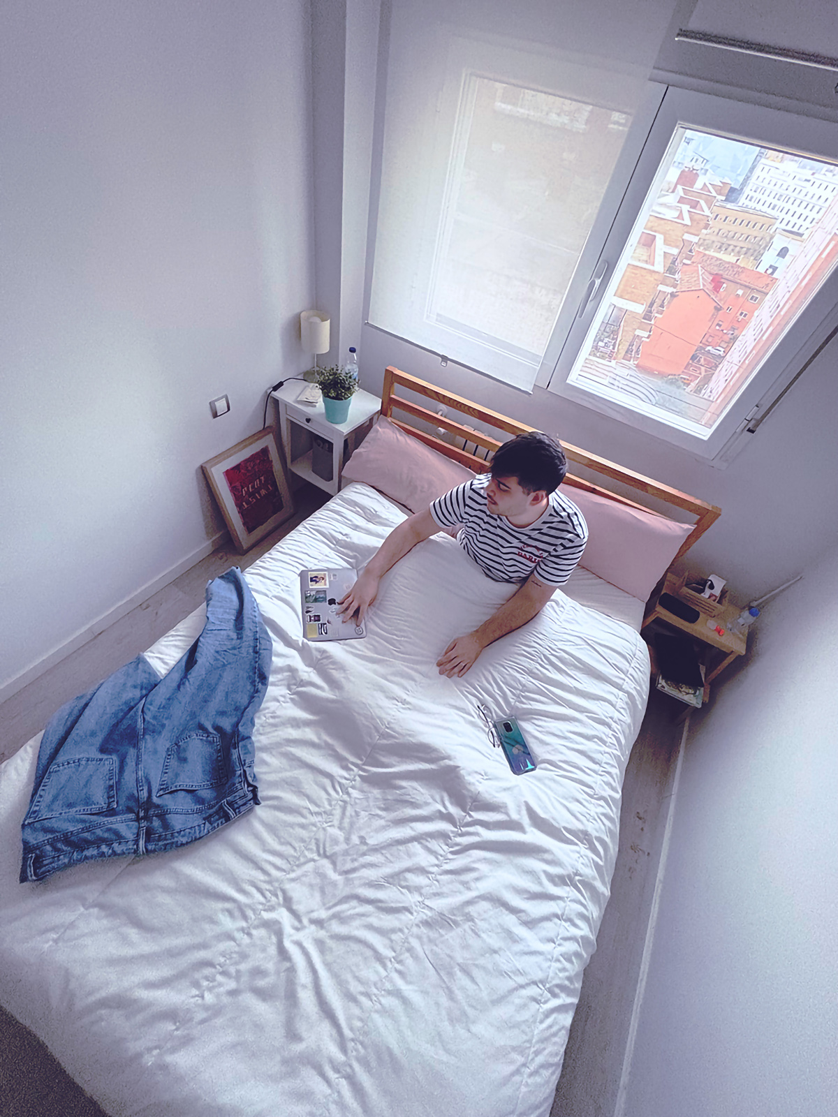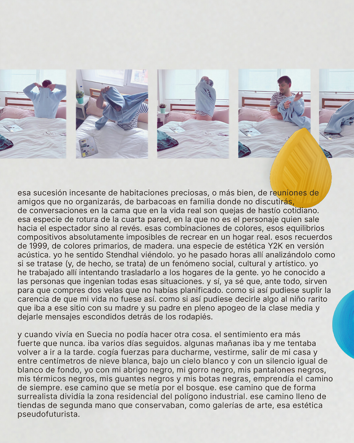 “Una tarde de verano. Estoy encajado entre el día y la noche. Entre un curso y el otro. Tumbado en mi habitación, pensando en todo lo que ha pasado este año, y en si el próximo traerá algo nuevo, algo que pinche la burbuja de la gente que me conoce y que cuchichea sobre mí. Algo, o quizá alguien. Tener 16 años es estar encajado entre una infancia nostálgica y una adultez incierta. Ser queer en el instituto significa ser privado de las historias de amor de todo el mundo. Estar solo significa estar aburrido. Soñar con una vida diferente. En California, montando una banda con amigos en el garaje. Cojo la bici y subo la cuesta. Después es cuesta abajo. Y cuesta arriba otra vez. Y de nuevo estoy encajado entre la cuesta abajo y la cuesta arriba. Solo puedo subir empujando. Pero este sol de verano en Madrid me da algo de energía.”